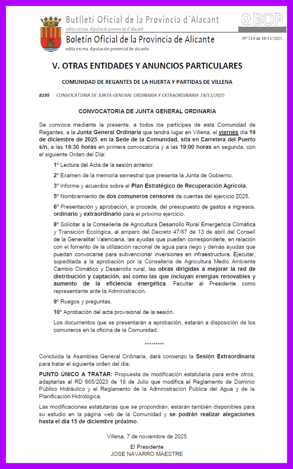 Convocada Junta General Ordinaria y Extraordinaria para el viernes 19/12/2025 a las 18:30 y 19:00 horas en primera y segunda convocatoria.